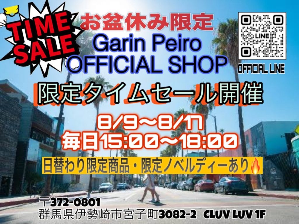 群馬県伊勢崎市、GarinPeiro OFFICIAL SHOPにて、お盆休みの8/9〜8/17の期間限定で毎日15:00〜18:00の時間でタイムセールを行います。